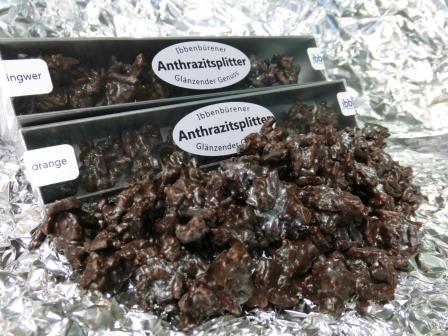 Glänzenden Genuss verspricht die neue Stadtpraline, der „Ibbenbürener Anthrazitsplitter“. Optisch den originalen Kohlestücken nachempfunden, haben auch die Schoko-Mandel-Splitter diesen geheimnisvollen Glanz. Neben 54 %Zartbitterschokolade und karamellisierten Mandelsplittern enthält die Köstlichkeit, je nach Geschmacksrichtung, kandierten Ingwer oder Orangen. Petra Ahrens, Inhaberin des LA Trüffels aus Laggenbeck, hat diese Praline kreiert und zu 50 g in edle, silberne Schachteln verpackt. Diese sind ab sofort in der Geschäftsstelle der Stadtmarketing Ibbenbüren GmbH zum Preis von 4,50 Euro erhältlich. Passend zur kommenden Weihnachtszeit oder auch einfach als Mitbringsel – der Ibbenbürener Anthrazitsplitter ist ein originelles, unverwechselbares Ibbenbüren-Produkt.